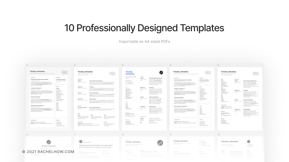 - Figma file of 10 editable resume templates that can be exported as PDF